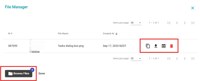 - Once the files are uploaded you can either copy, download, view or delete them using the controls on the right-hand side.