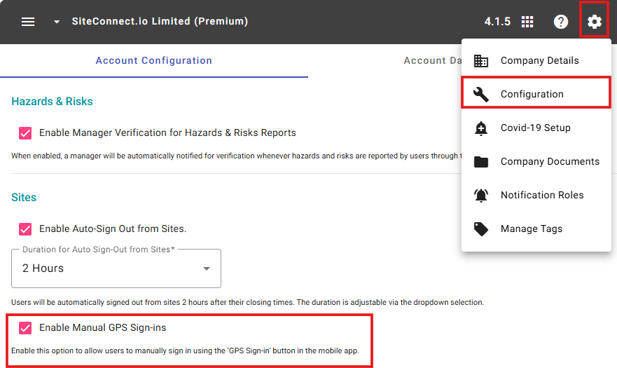 Click the Cog Wheel to open your settings, then select Configuration. From there, you can enable or disable Manual GPS Sign‑Ins. When the option is ticked, manual sign‑ins are turned on; when it’s unticked, they’re off. Don't forget to click on Save once you have made your selections.